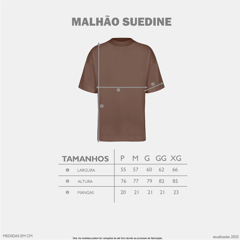Camiseta MalhĂŁo Suedine Oversized Descubra a uniĂŁo perfeita entre robustez e sofisticação com a Camiseta MalhĂŁo Suedine Oversized. Confeccionada em malha com gramatura de 230 g/m², essa peça foi desenvolvida para oferecer qualidade e durabilidade excepcionais, ideal para o dia a dia urbano. Qualidade Superior: A malha Suedine, aliada Ă alta gramatura, garante um toque macio e resistĂŞncia, mantendo a forma mesmo apĂłs mĂşltiplas lavagens. Modelagem Oversized: Com um caimento perfeito, a camiseta proporciona conforto sem abrir mĂŁo de um estilo moderno e despojado, pensado para o pĂşblico urbano. Detalhe Exclusivo: A gola canelada 2Ă—1 com 3,5 cm, confere um toque refinado e contemporâneo, destacando o design Ăşnico e inovador da peça. Versatilidade no Estilo: Ideal para compor desde looks casuais atĂ© produções mais ousadas, a Camiseta MalhĂŁo Suedine Oversized se torna um item indispensável para quem valoriza autenticidade e personalidade no vestuário. Eleve seu guarda-roupa com a Camiseta MalhĂŁo Suedine Oversized e experimente o equilĂbrio ideal entre conforto, durabilidade e design contemporâneo, feita especialmente para os amantes do estilo urbano.